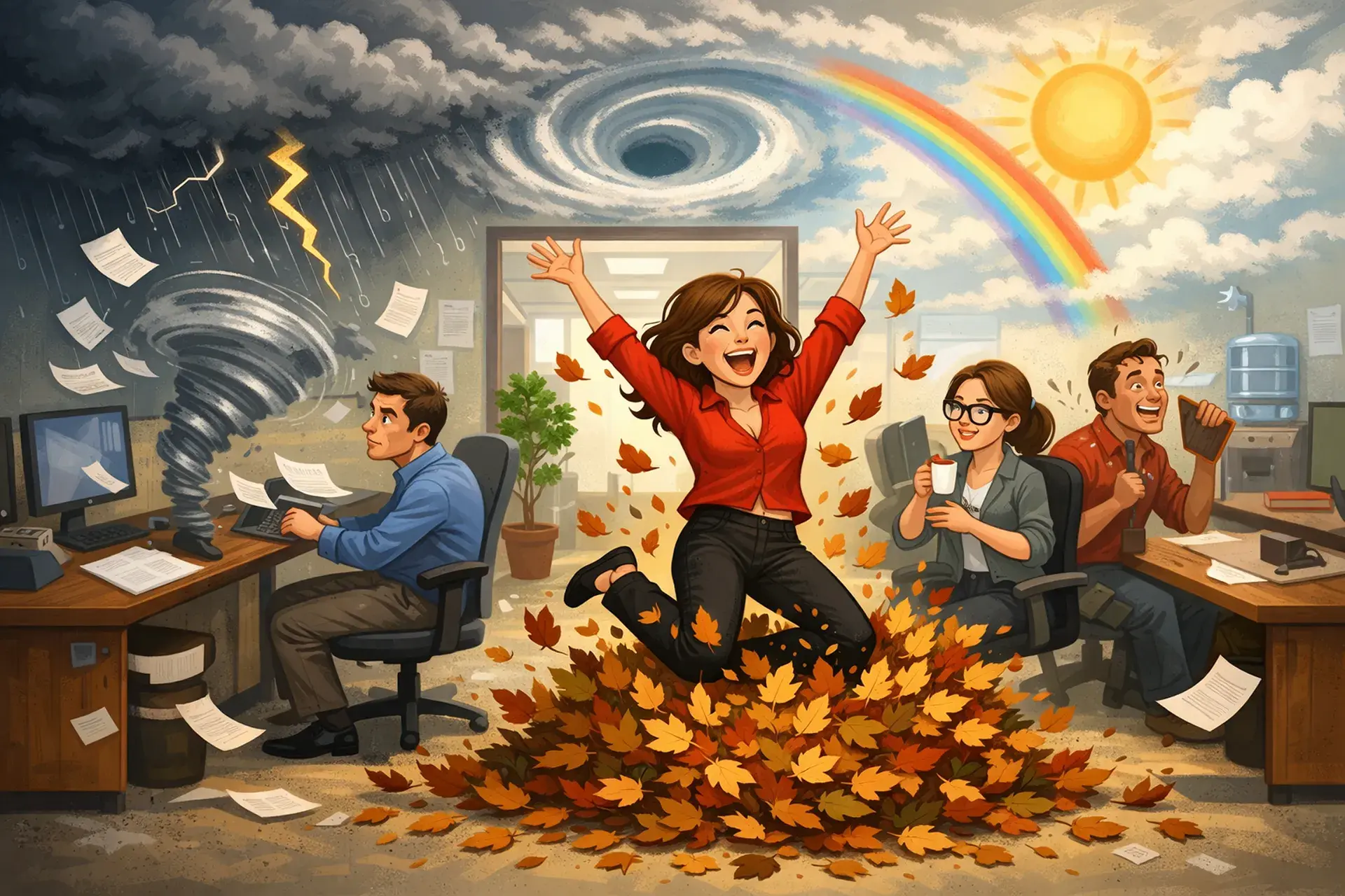 I gathered up every leaf into a small pile and placed it right next to my desk. Now everyone was staring at me. I took a slight bow and then proceeded to walk down the hallway, still in everyone’s view. I then turned around and sprinted an Olympic-style sprint straight for that pile, jumping right in and sending all 20 leaves scattering everywhere! Immediately, there was laughter, a few smiles, and even several people commenting on how they used to do that kind of thing when they were kids. The mood lifted significantly with a simple, childlike gesture!